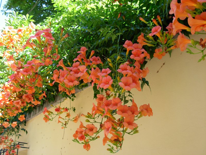I fiori arancioni della Bignonia radicans creano un effetto visivo spettacolare, soprattutto durante la piena fioritura. Le foglie verde scuro e i fiori vivaci rendono questa pianta un elemento ornamentale perfetto per giardini e spazi esterni.
